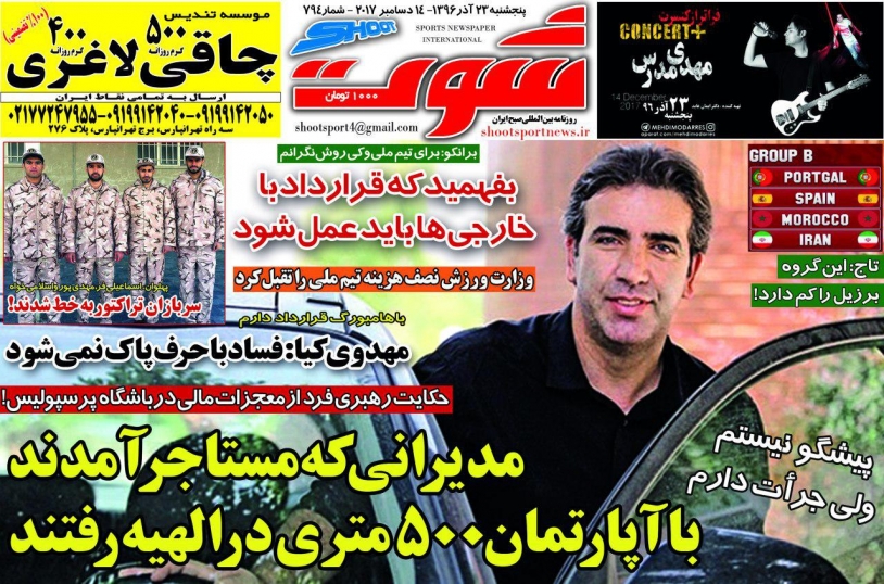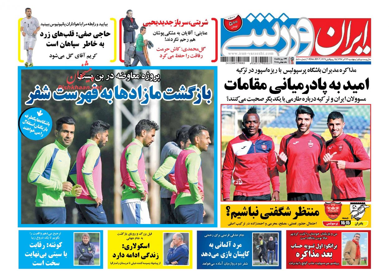 در پیشخوان امروز ، صفحه نخست روزنامه های ورزشی پنجشنبه 23 آذر 1396 را مشاهده می کنید.