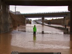 حجم آب در پل زیرگذر به حدی است که امکان تردد خودروها وجود ندارد و این جاده مسدود شده است.