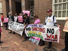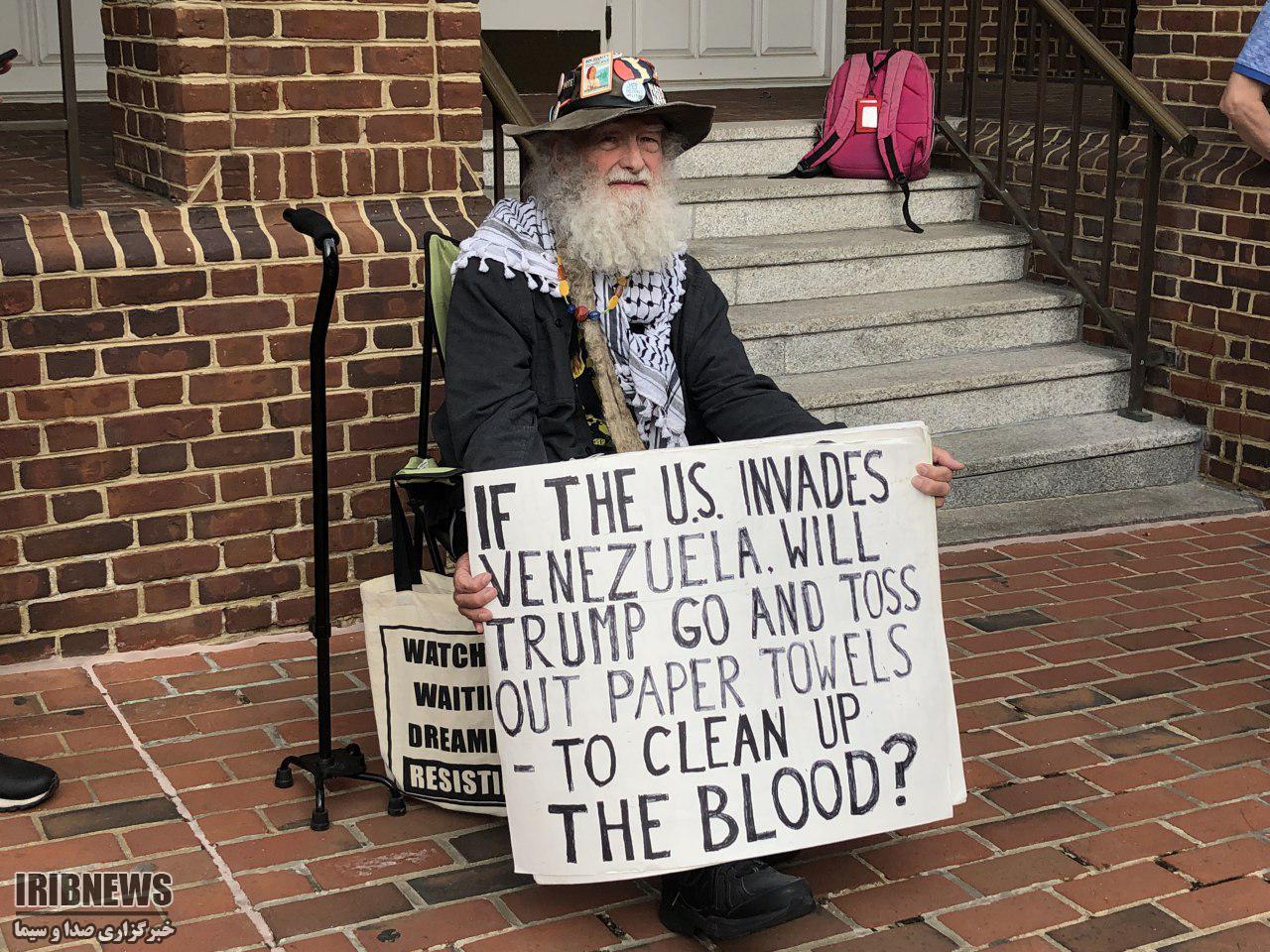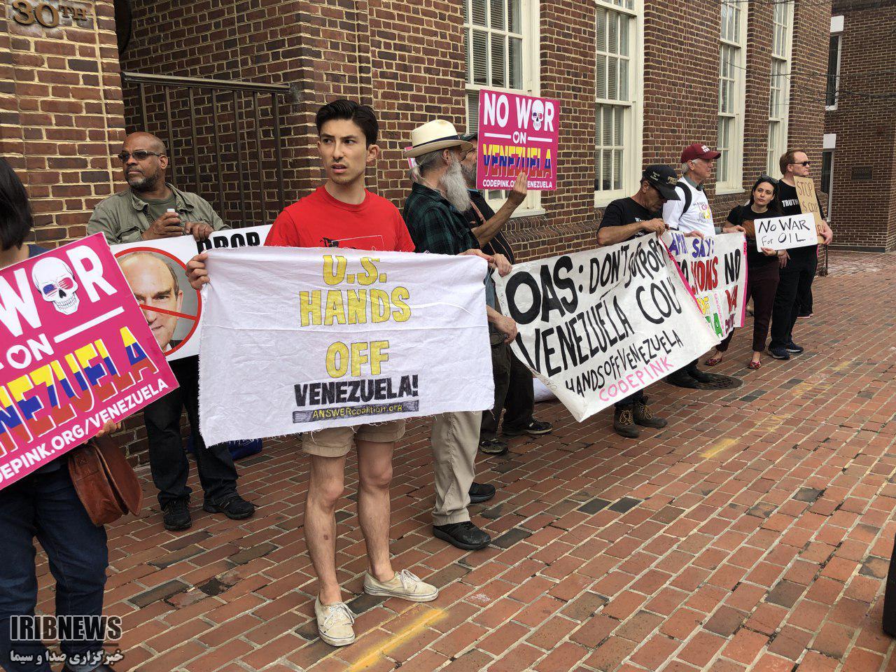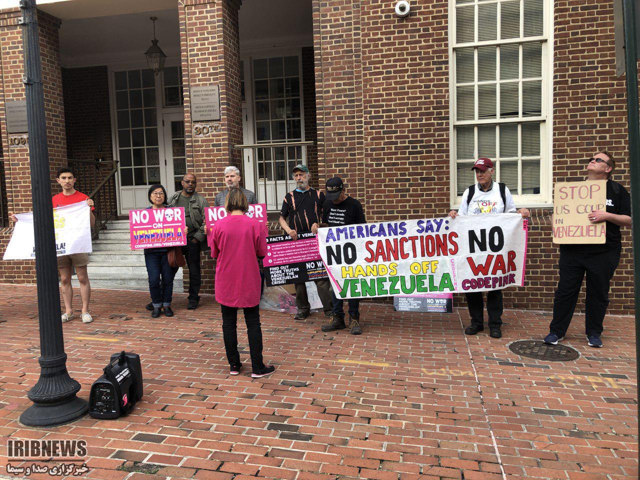 جمعی از فعالان آمریکایی در اعتراض به دخالتهای واشنگتن در امور داخلی ونزوئلا روبروی سفارت این کشور در واشنگتن تجمع کردند.