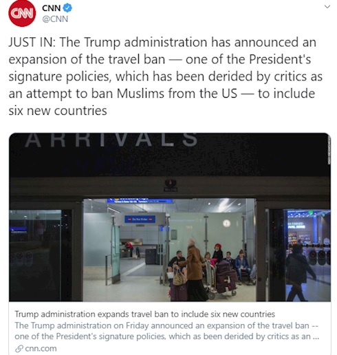 به گزارش سرویس بین الملل خبرگزاری صدا و سیما؛ پایگاه اینترنتی شبکه سی ان ان اعلام کرد: بر اساس تصمیم جدید دولت ترامپ که منتقدین از آن به عنوان تلاشی برای ممنوع کردن ورود مسلمانان به آمریکا یاد کرده اند ورود اتباع شش کشور شامل اریتره، قرقیزستان، میانمار، نیجریه، سودان و تانزانیا به این کشور ممنوع اعلام شده است.