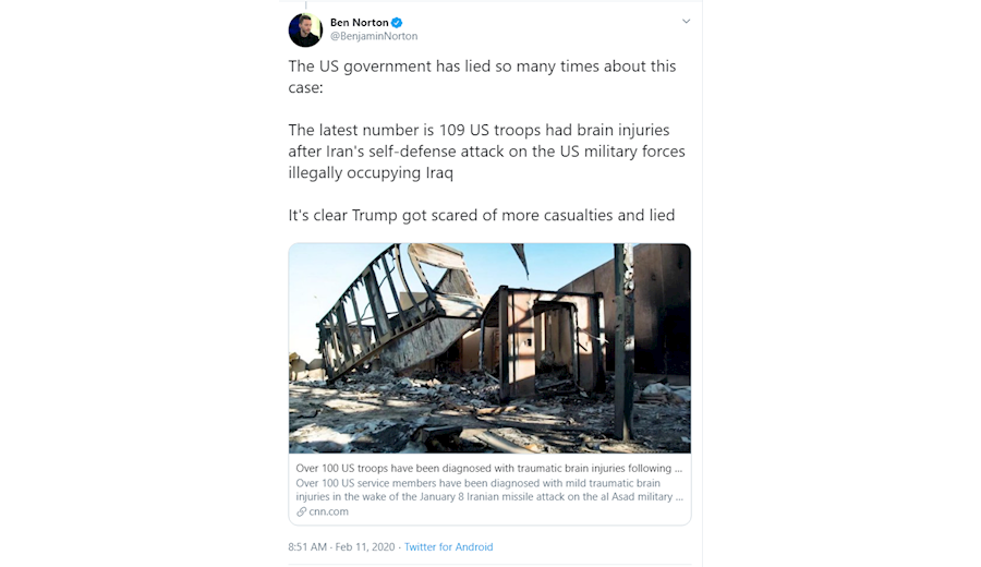 -بنجامین نورتون، روزنامه نگار آمریکایی: "دولت آمریکا بار‌ها در این باره دروغ گفته است. آخرین آمار ۱۰۸ سرباز آمریکایی با آسیب مغزی پس از حمله تدافعی ایران به نیرو‌های نظامی آمریکا است که به طور غیرقانونی عراق را اشغال کرده اند. واضح است ترامپ از تلفات بیشتر واهمه داشت و دروغ گفت. "