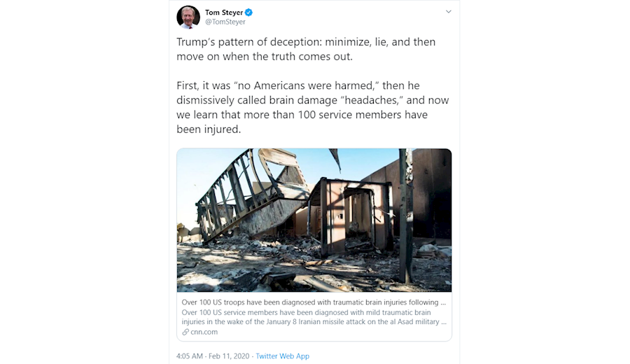 -تام استایر نامزد دموکرات انتخابات ریاست جمهوری آمریکا: "الگوی فریب ترامپ: کوچک شمردن، دروغ گفتن و بعد، زمانی که حقیقت افشا شد، به حرکت ادامه دادن. ابتدا این گونه بود «هیچ آمریکایی آسیب ندیده است»، بعد با دست کم گرفتن (موضوع)، آسیب مغزی را «سردرد» خواند، و اکنون مطلع شده ایم که بیش از ۱۰۰ نظامی آسیب دیده اند. "