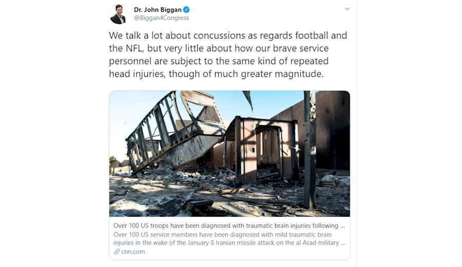 -جان بیگان، نامزد انتخابات کنگره آمریکا: "ما درباره بحث‌ها در خصوص فوتبال و لیگ ملی زیاد حرف می‌زنیم، اما درباره اینکه چطور نیرو‌های نظامی شجاع ما در معرض آسیب‌های مکرر مغزی مشابه، اما با شدت بیشتر قرار دارند، خیلی کم. "