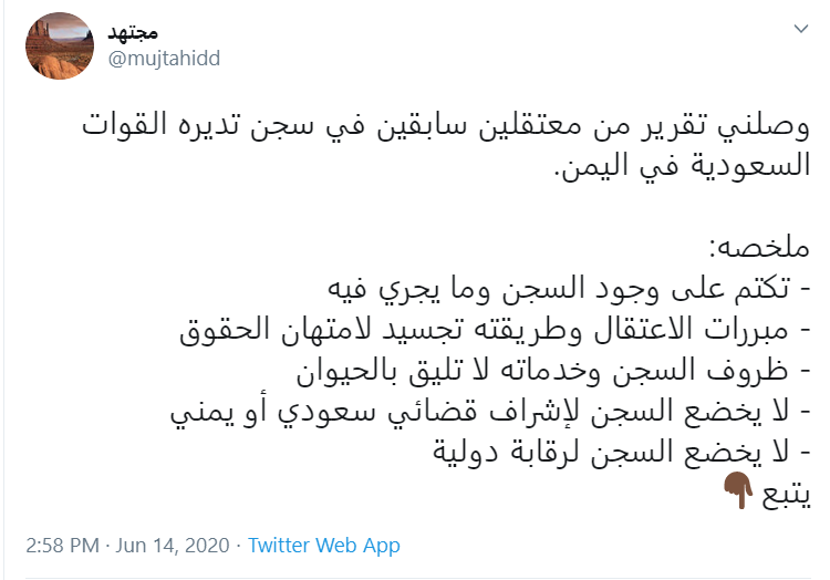 مجتهد، فعال توییتری مشهور که اطلاعات زیادی از خاندان آل سعود دارد در توییتی نوشت: گزارشی درباره وضع زندانیان سابق زندان تحت اداره نیرو‌های عربستان در یمن به دستم رسیده است.