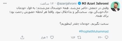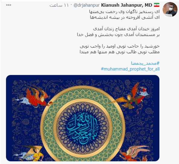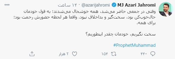 به گزارش شبکه مردم خبر گروه مجازی خبرگزاری صدا و سیما، همزمان با ۱۷ ربیع الاول میلاد باسعادت حضرت ختمی مرتبت محمد مصطفی (ص) و امام جعفر صادق (ع) امام ششم شیعیان، کاربران فضای مجازی در توئیتر نیز دست به کار شدند و ضمن تبریک این روز، در وصف پیامبر اعظم (ص) نوشتند.