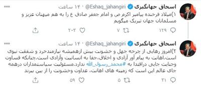 اسحاق جهانگیری معاون اول رئیس جمهور در رشته توئیتی نوشت: میلاد فرخنده پیامبر اکرم (ص) و امام جعفر صادق (ع) را به هم میهنان عزیز و مسلمانان جهان تبریک میگویم.