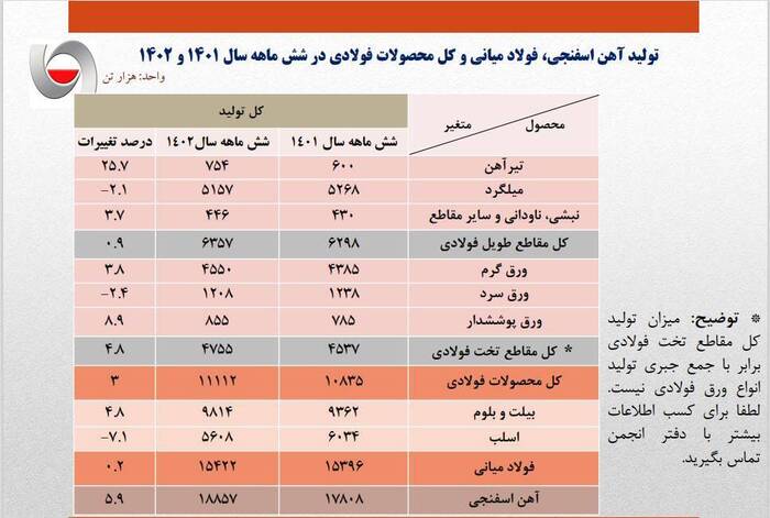 بر اساس آمار انجمن تولید کنندگان فولاد ایران، در این مدت ۱۵ میلیون و ۴۲۲ هزار تن شمش فولادی تولید شده که در مقایسه با مدت مشابه پارسال، ۵.۸ درصد کاهش را نشان میدهد. همچنین از این میزان شمش فولاد تولیدی، ۱۱ میلیون و ۷۳۳ هزار تن به مصارف داخلی اختصاص یافته و حدود سه میلیون و ۷۰۰ هزار تن آن صادر شده است.