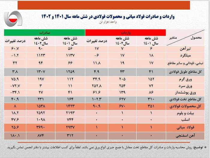خبرگزاری صدا و سیما از مجموع ۵۶.۵ میلیون تن تولید فولاد کشور در انواع مقاطع و شمش فولاد، محصولات فولادی و آهن اسفنجی در ۶ ماه ابتدایی سال ۱۴۰۲ ، حدود ۵۰ میلیون تن صرف مصارف داخلی و بقیه صادر شده است.