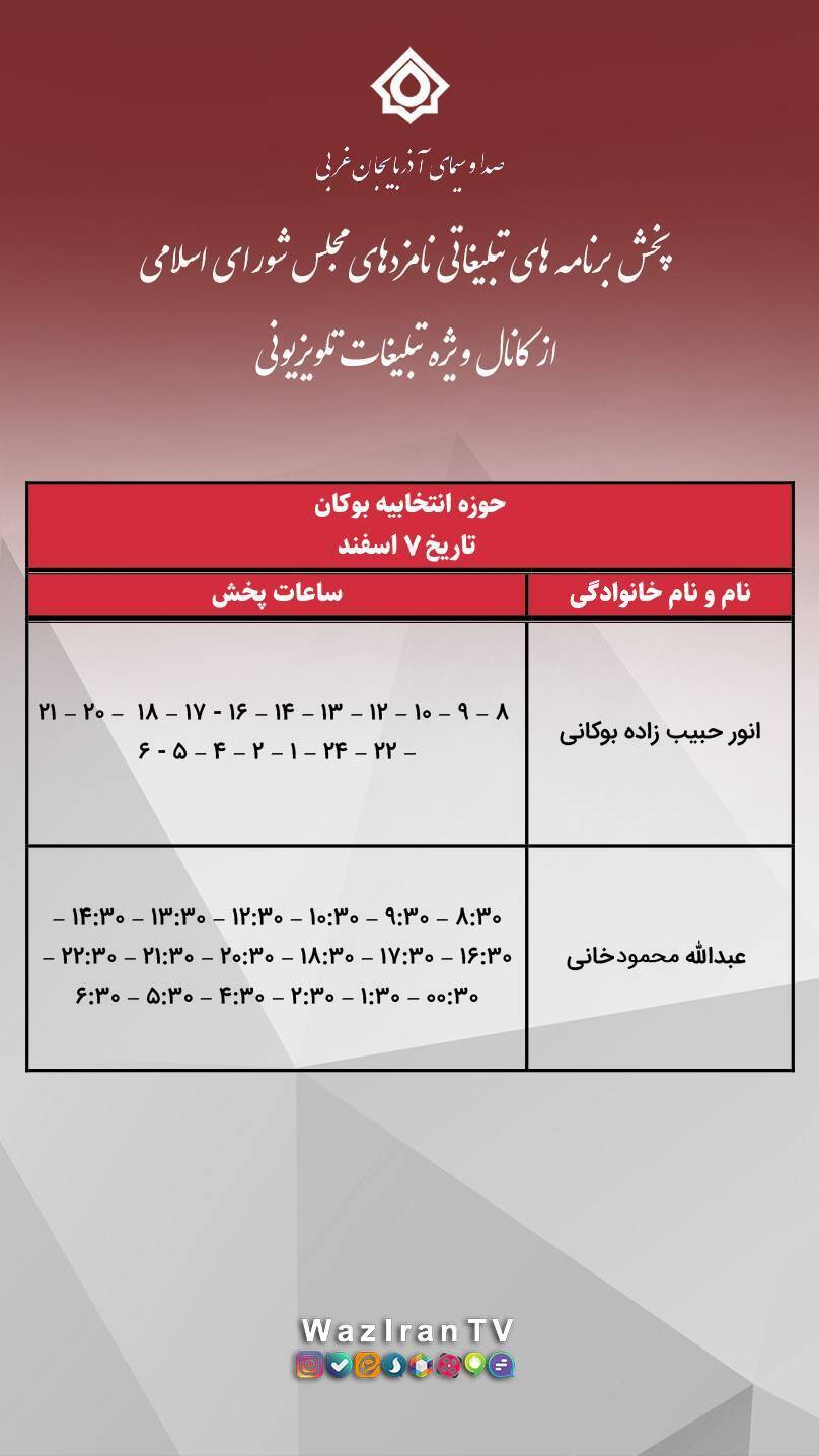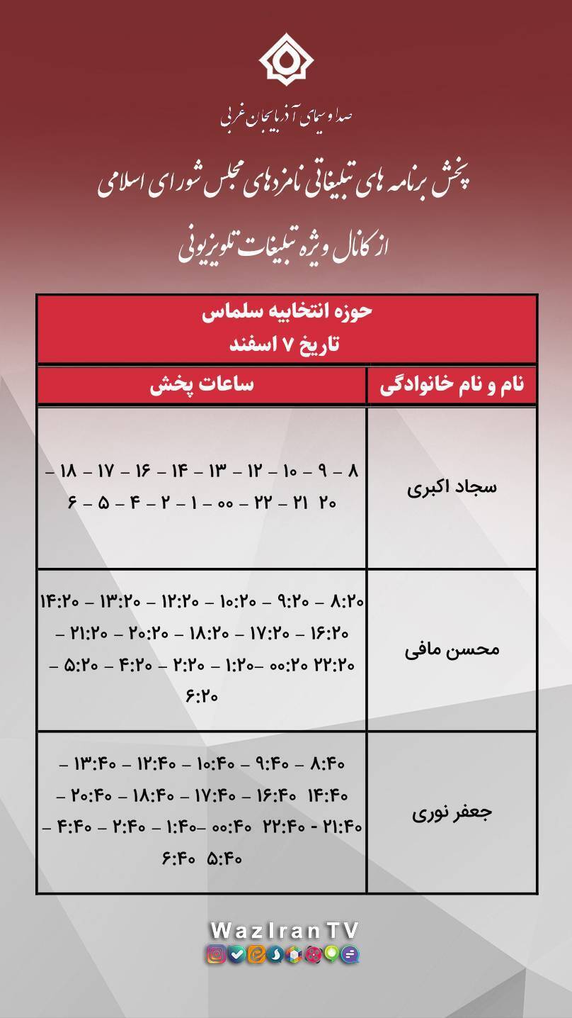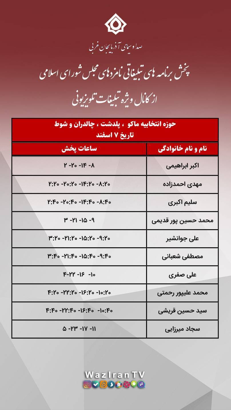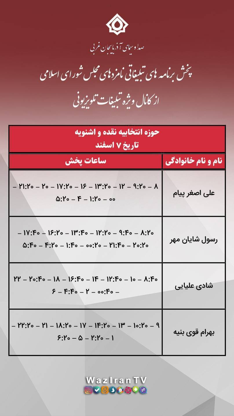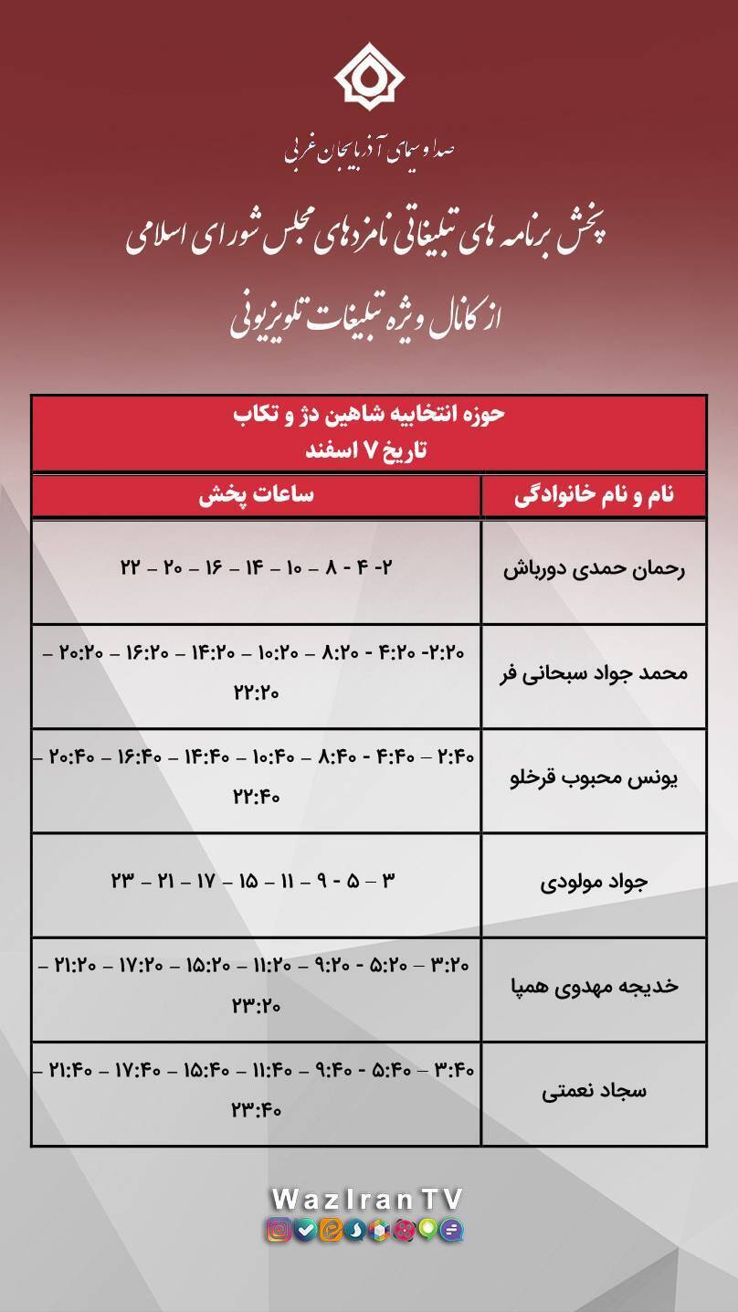 جدول پخش تبلیغات نامزد‌های حوزه انتخابیه آذربایجان غربی در ۷ اسفند