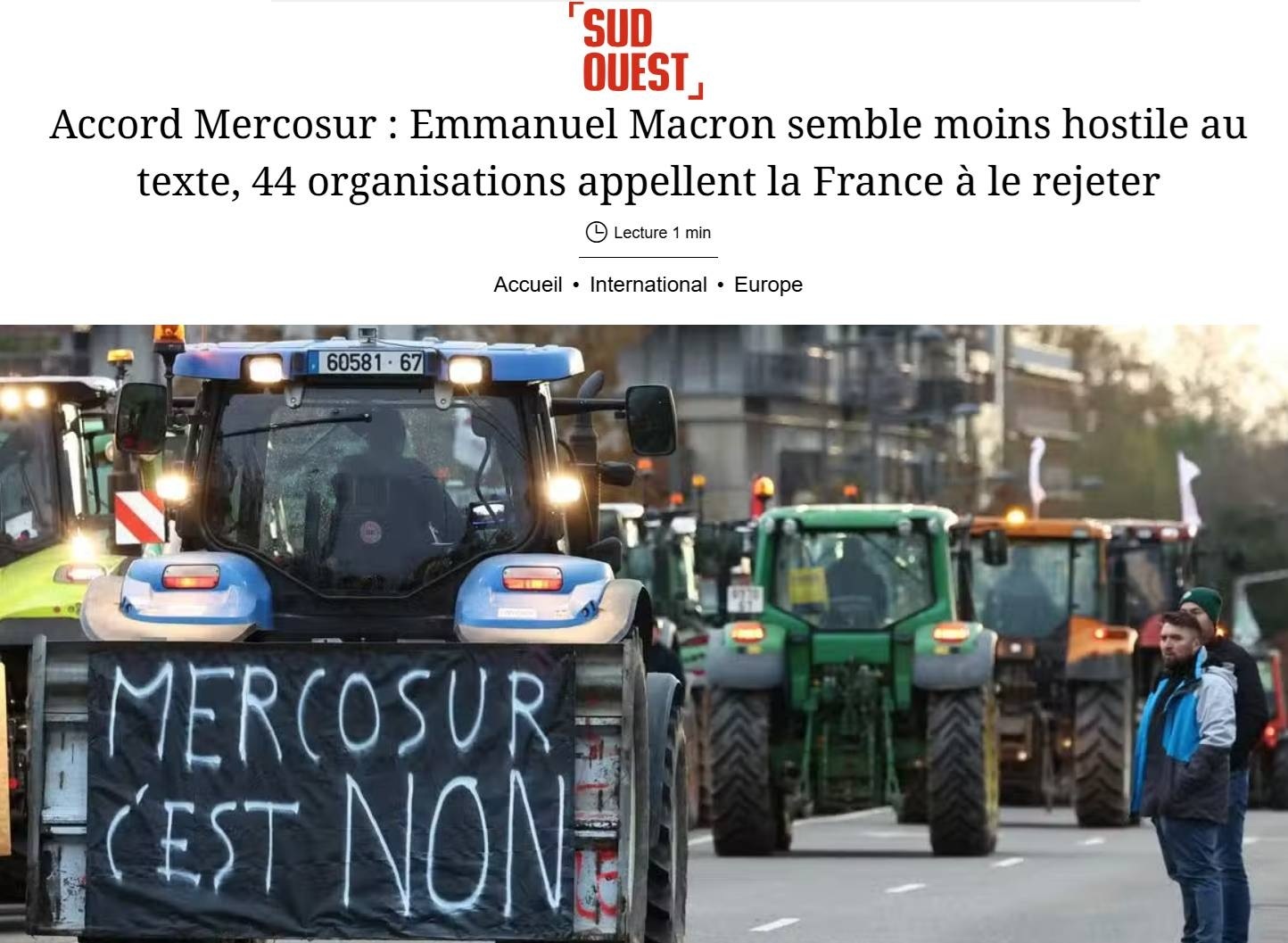سود وست – توافق مرکوسور (پیمان تبادل تجاری اتحادیه اروپا و ۵ کشور آمریکای لاتین) و تغییر موضع و نرمش مکرون درباره متن توافقنامه؛ ۴۴ اتحادیه غیردولتی و سازمان غیردولتی شفافیت این موضع گیری را خواستار شدهاند.