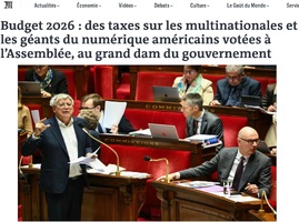 لوموند – بودجه ۲۰۲۶؛ مالیاتهای جدید بر شرکتهای چندملیتی و غولهای اینترنتی آمریکا در نخستین دور در مجلس به رای گذاشته شد. این مسئله نارضایتی دولت را در پی داشت. درآمد این مالیاتها ۲۰ میلیارد یورو است.